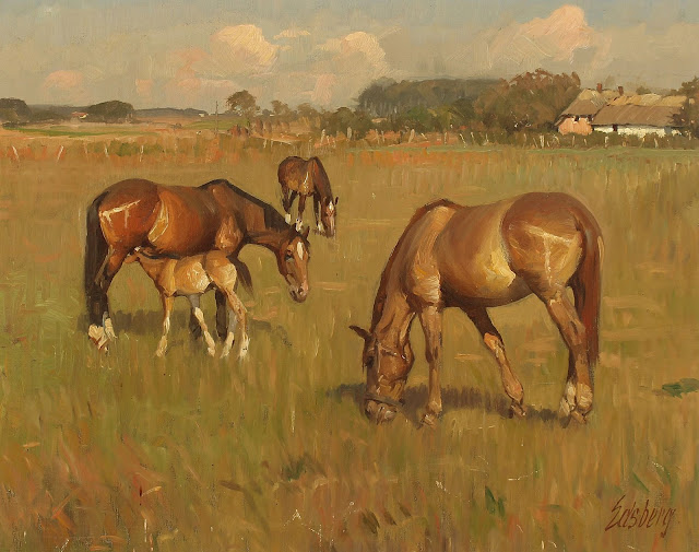 KNUD EDSBERG - Cavalos no campo - Óleo sobre tela - 40 x 50
